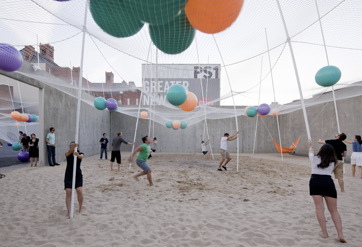 One of our first projects, Pole Dance, reacted to the idea of modernity and the way we use systems and structures to organize our life. Systems are not neces sarily rigid but are pliable. We, as beings and bodies, can actually affect their structure. In Pole Dance, we were trying to motivate people to engage with a wide grid, which was a metaphor for that Modernist cartesian envelope. It was also a response to the fact that we’re spending a lot of time in the digital realm – how do we agitate bodies to get physical? We wanted the architecture to push back, be responsive but also volatile, so it could slap you in the face like, “HEY, wake up!”