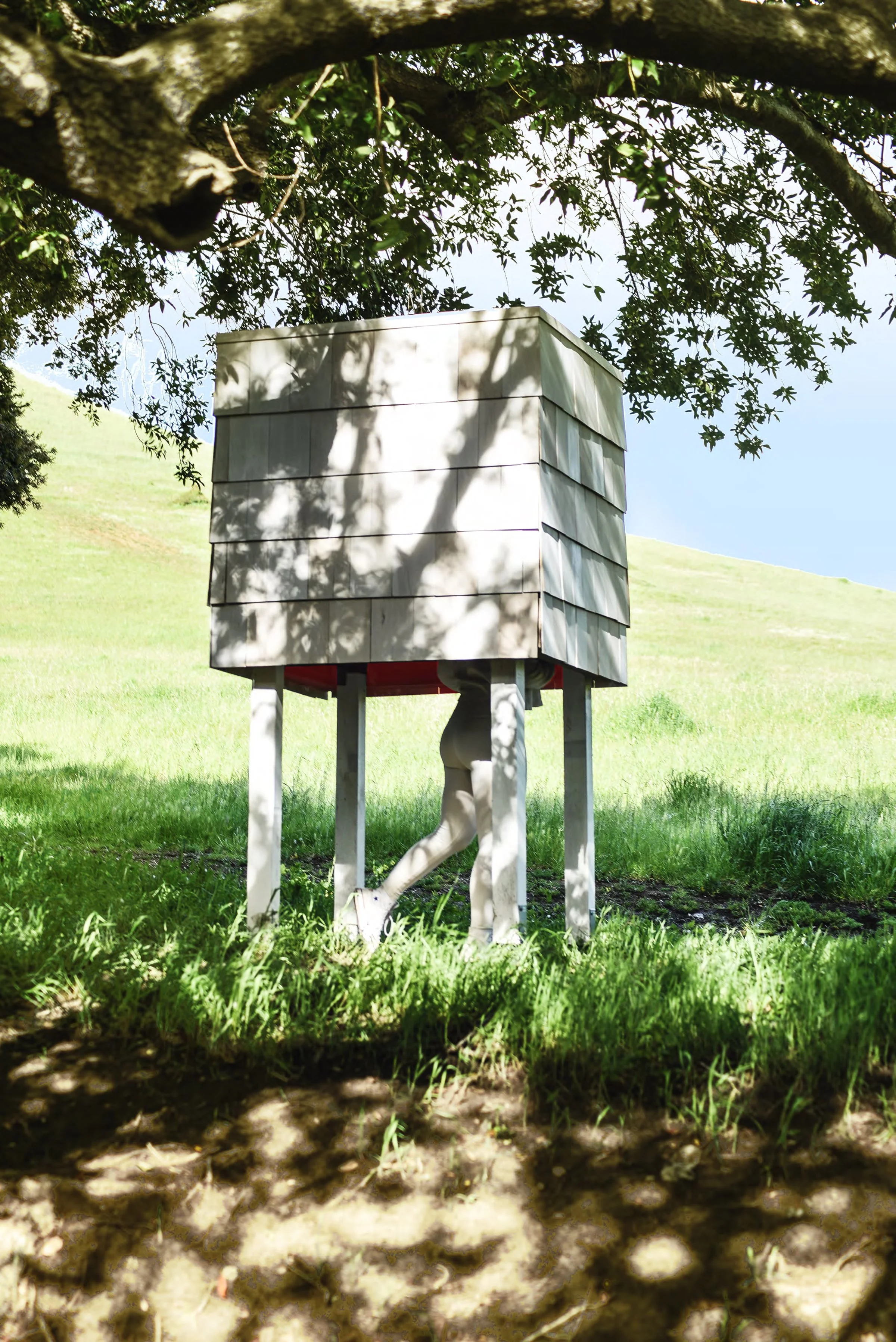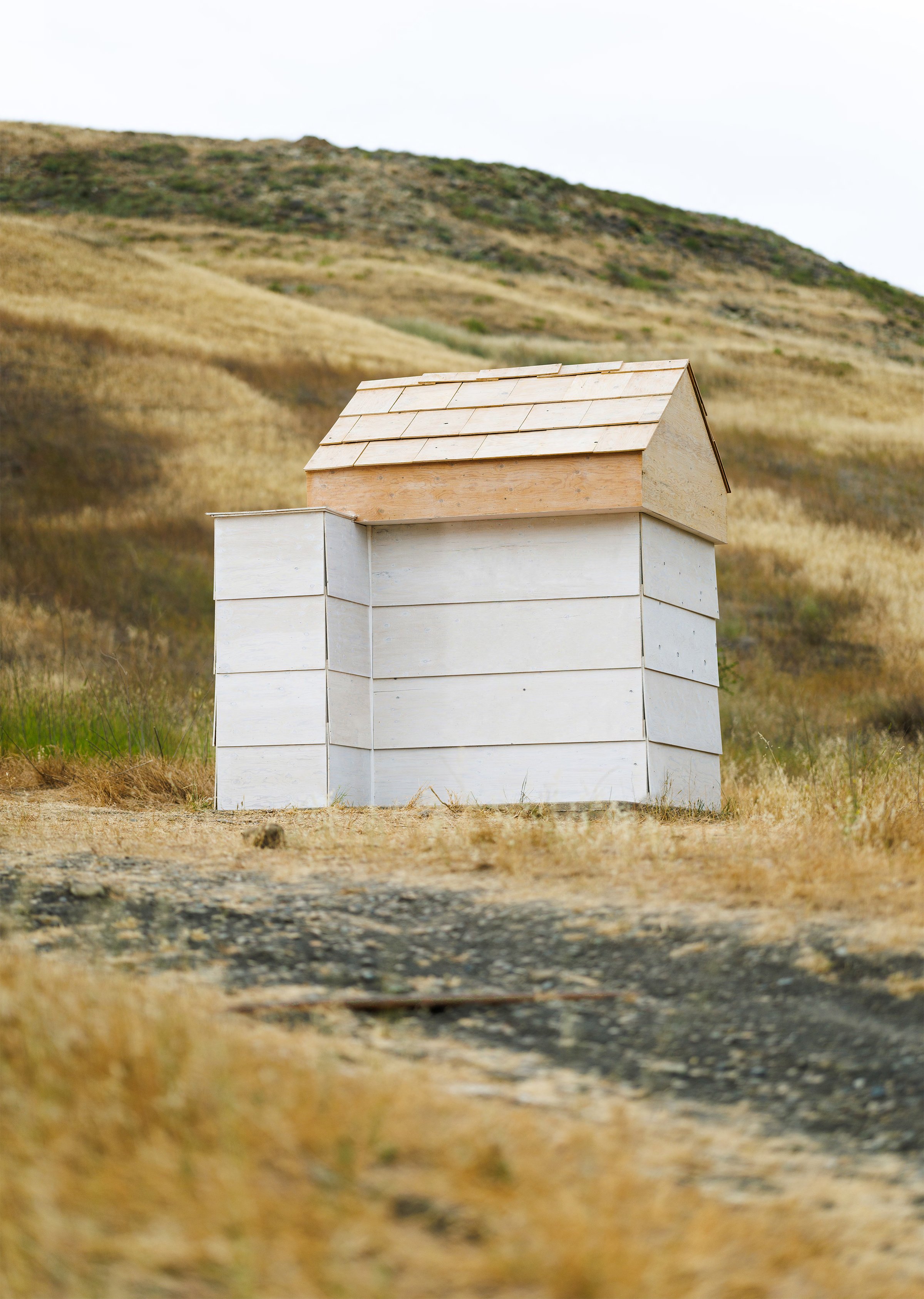 The material palette reinforces the familiarity of Central Valley Accessories. CDX plywood—the lowest grade sheet wood readily available—is typically used in agricultural settings for its affordability and durability. In the Poly Canyon Accessories, it is treated with traditional whitewashed lime, recalling the sun-bleached, utilitarian finishes of agricultural tradition. The oversized two-foot lap siding and one-foot-six-inch shingles exaggerate conventional cladding dimensions, creating a play on scale that mimics and transcends the language of the typology set. The Poly Canyon Accessories operate as distilled abstractions of the region’s architectural fabric, narrowing the gap between subject matter and installation