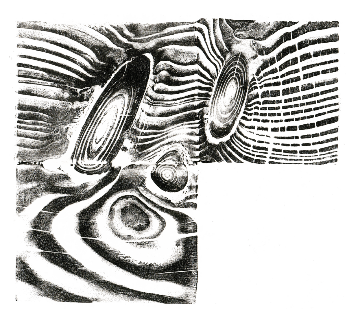 The process of working wood with your own hands connects you to the soul of a tree: for many woodworkers, sawing, chiseling and gouging into wood is more an active conversation with trees than the imposition of their own will onto an inert substrate. This series of prints aims to abstract this understanding of cutting wood as an act of revealing and reading through a process of direct relief printing. The cuts made into the wood are printed so that in the resulting image the wood unfolds onto the picture plane — visually chopping it into orthogonal sections on the page. The eye intuitively folds the wood back together, implying the space within the wood and inviting the imagination to consider the living matrix of embodied memory within both every tree and every two by four.